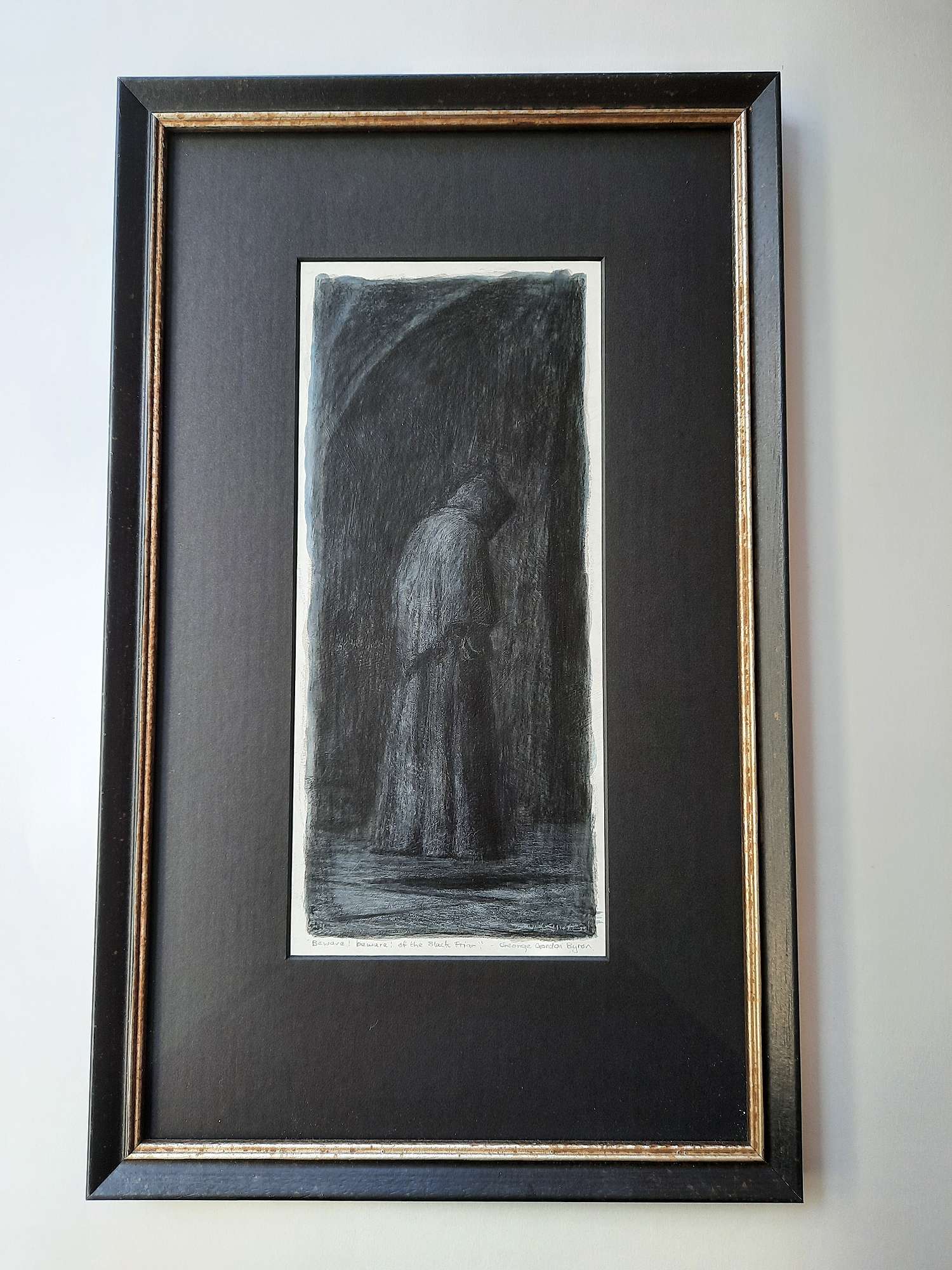 David's artwork, a stunning black and white pastel with coloured acrylic gel accents, brings to life the haunting tale of the Black Friar of Newstead Abbey, Byron’s ancestral home, a place of eerie, captivating history which inspired much of his poetry.