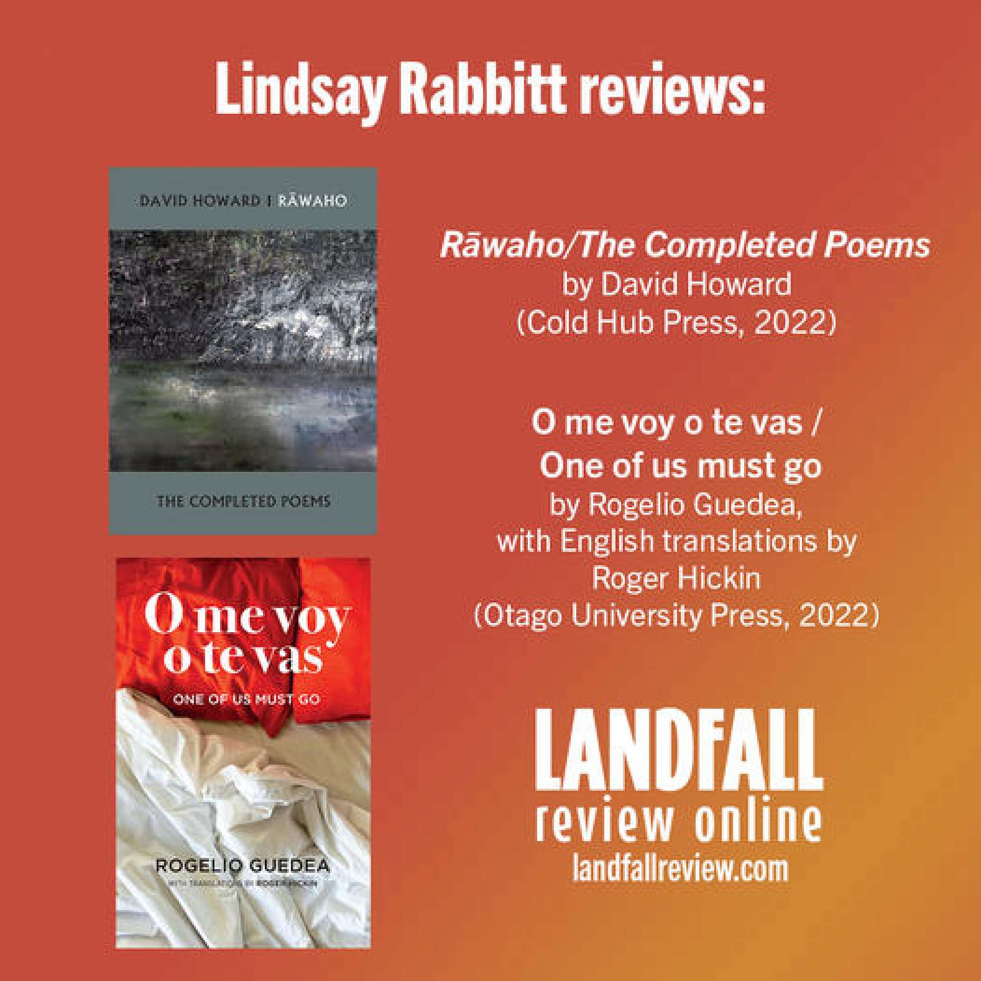 O me voy o te vas / One of us must go by Rogelio Guedea with English translations by Roger Hickin (Otago University Press, 2022) and Rāwaho/The Completed Poems by David Howard (Cold Hub Press, 2022)