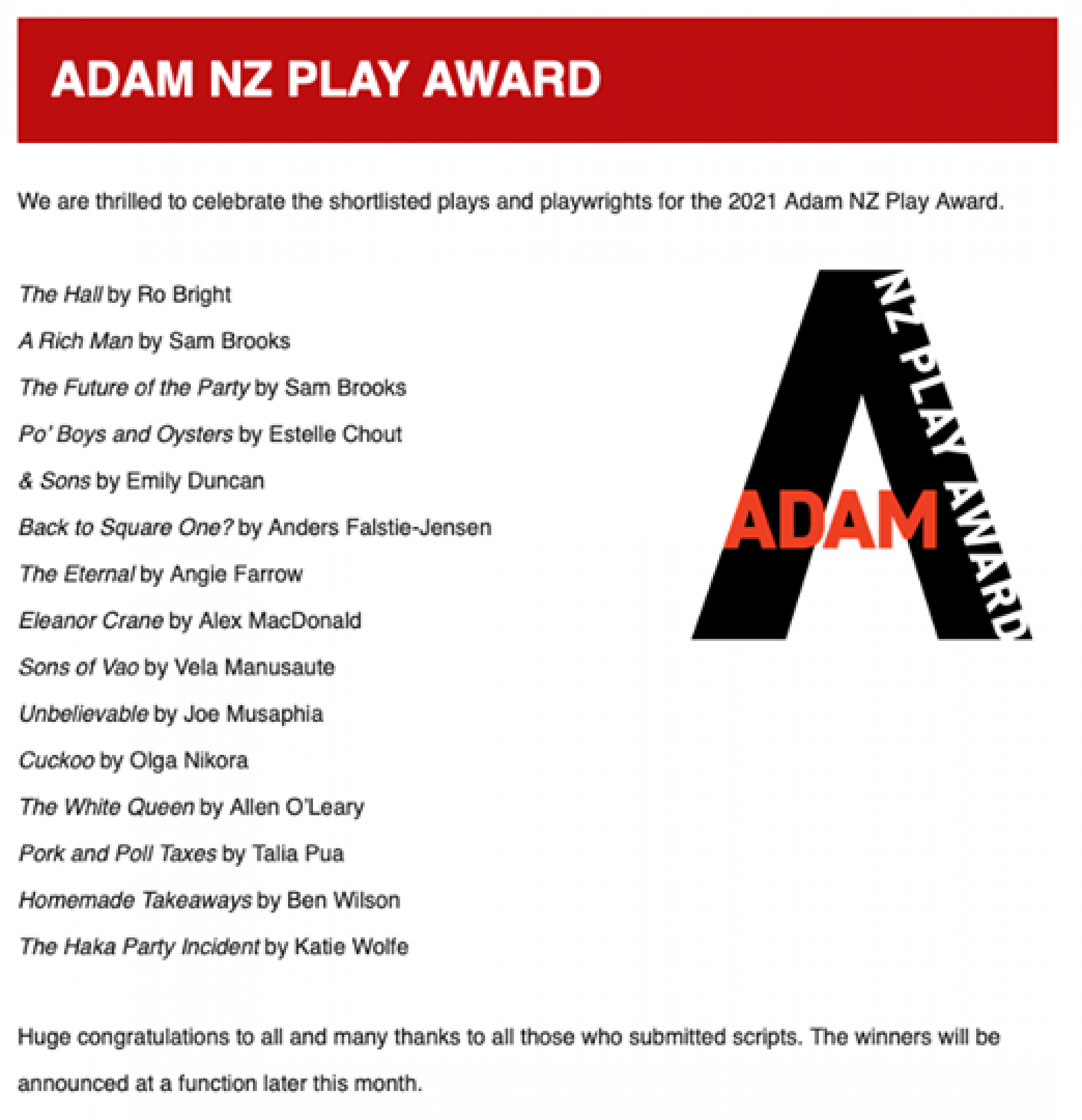 The Adam NZ Play Award Shortlist is out.