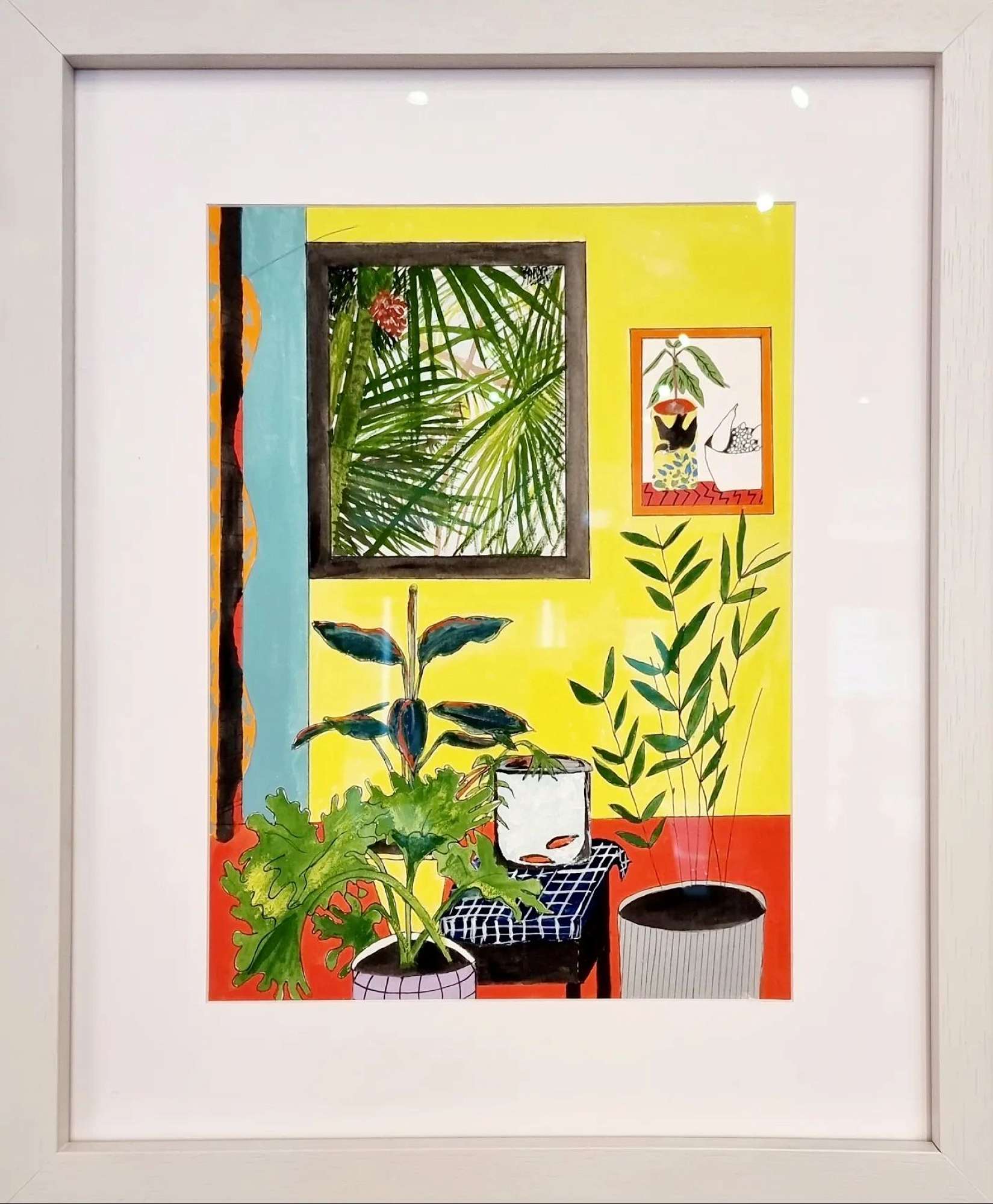 Influenced by various modern and postmodern artists, Lynda has painted a modernist interior where they share the same space.