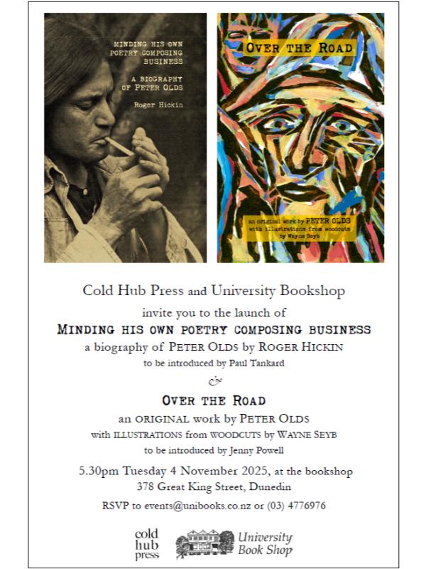 MINDING HIS OWN POETRY COMPOSING BUSINESS will be launched along with OVER THE ROAD, an original work by Peter Olds…University Book Shop, 378 Great King Street, Dunedin