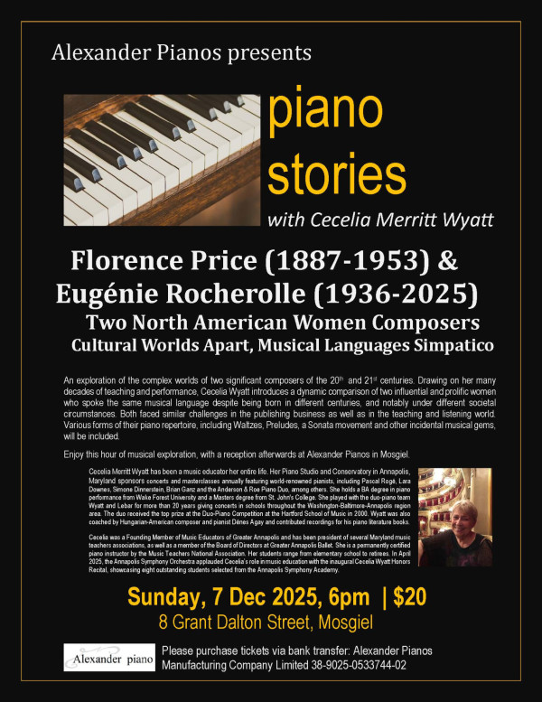 Enjoy this hour of musical exploration, with a reception afterwards at Alexander Pianos in Mosgiel.