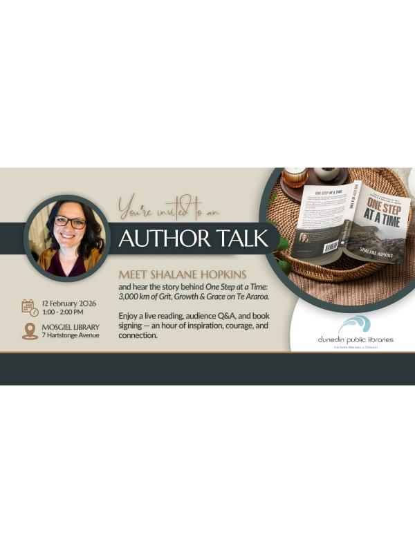Meet Shalane Hopkins and hear the story behind One Step at a Time: 3,000km of Grit, Growth on Te AraroaMosgiel Library, 7 Hartstonge Avenue