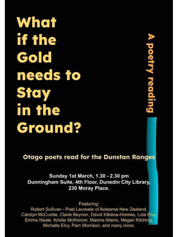 Otago poets read for the Dunstan Ranges Featuring: Robert Sullivan - Poet Laureate of Aotearoa New Zealand Carolyn McCurdie Claire Beynon David Kārena-Holmes Lola Elvy Emma Neale Kirstie…Dunningham Suite, 4th Floor, Dunedin City Library, 230 Moray Place