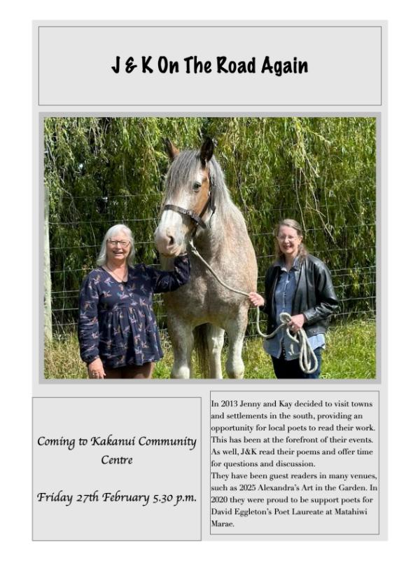 In 2013 Jenny and Kay decided to visit towrn and settlements in the south, providing an opportunity for local poets…Kakanui Community Centre